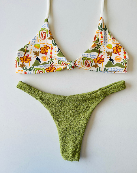 O Conjunto Encantos da Serra é uma homenagem às paisagens que se elevam entre o mar e o céu, onde a vegetação densa encontra o vento fresco e o silêncio das trilhas. O top com nó frontal, estampado com a arte exclusiva da coleção Encantos de Vargem, traduz essa riqueza natural em formas e cores, unindo mar, fauna, serra e terra em uma composição que pulsa autenticidade e leveza.