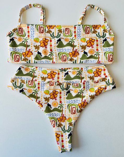 O conjunto Encantos do Alto traduz a imponência das montanhas e o silêncio sereno das paisagens elevadas de Vargem. Sua estampa, escolhida especialmente para esta coleção, celebra a conexão entre mar, serra, fauna tropical e caminhos de terra, representando com leveza tudo aquilo que nos eleva e nos inspira.