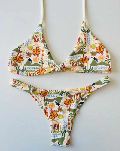 O conjunto Encantos do Vale traduz com leveza a alma tropical da ApraiÓh. Sua estampa foi escolhida especialmente por transmitir, com beleza e delicadeza, os elementos naturais que inspiram a coleção Encantos de Vargem: a serra, o mar, a fauna vibrante, a areia quente e os caminhos de terra.