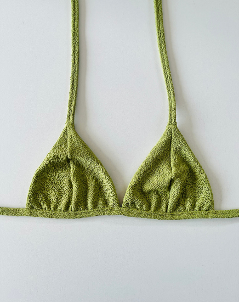 O Top Triângulo Fixo Encantos da Serra carrega a essência da vegetação nativa, do frescor das matas e da imponência das montanhas que abraçam o interior. Em tom verde oliva com textura suave, essa peça representa a cápsula Serra da coleção Encantos de Vargem, evocando a conexão com a natureza intocada e seus refúgios de sombra e silêncio.