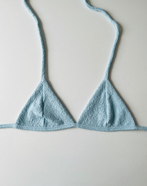 O Top Triângulo Encantos do Mar traduz o encontro entre simplicidade e natureza selvagem. Em azul mediterrâneo texturizado, essa peça evoca a profundidade serena do mar, das cachoeiras e dos rios que esculpem caminhos e histórias, inspiração central da cápsula Mar, da coleção Encantos de Vargem.